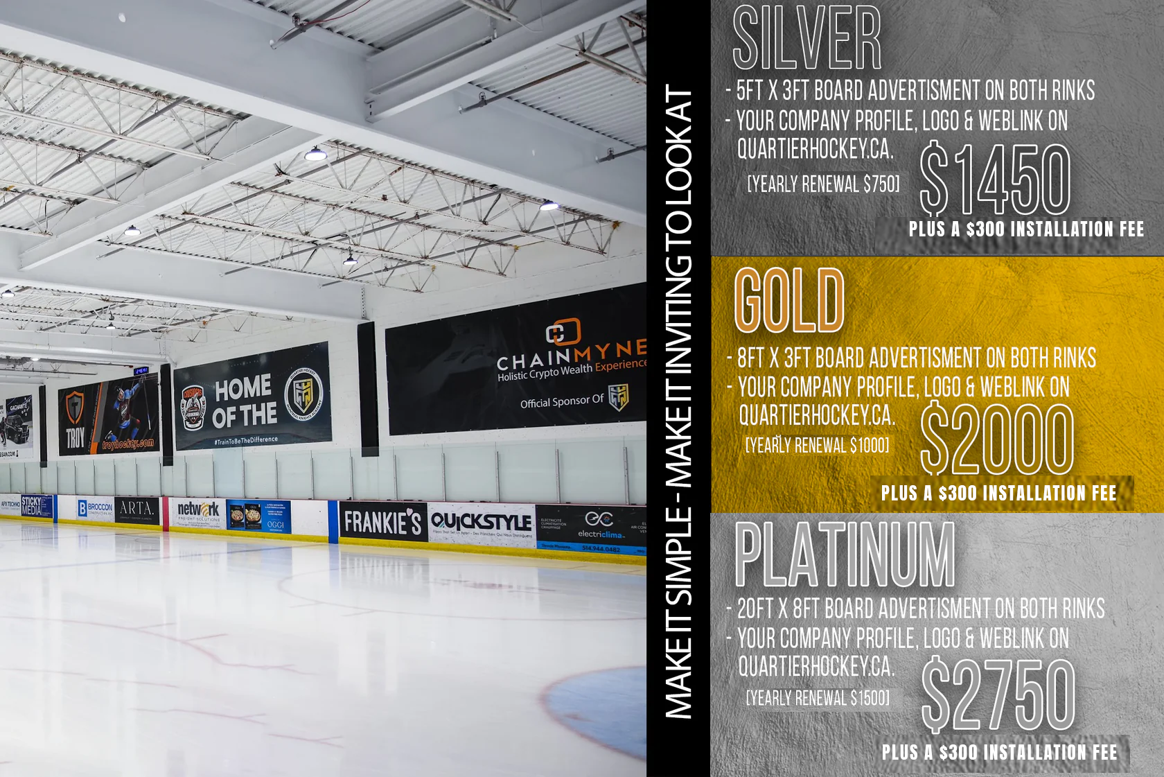 Quartier Hockey offers one-year Advertisement partnerships, with renewal options, providing brands with exceptional visibility within our facility and across our online platforms.